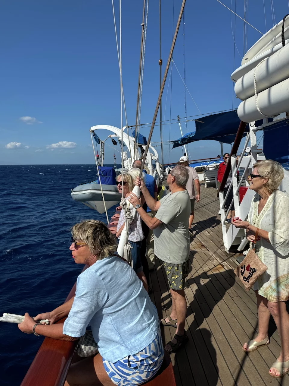 Trotz der Schaukelei haben wir viel Zeit mit Plaudereien auf dem Sonnendeck verbracht und diesen tollen Blick über die schaumgekrönten Wellen genossen.