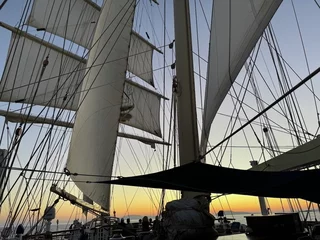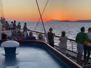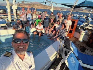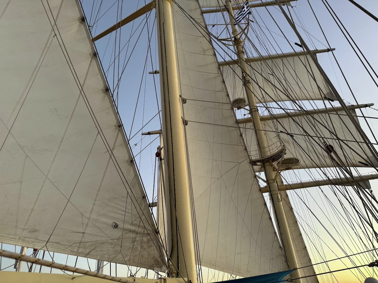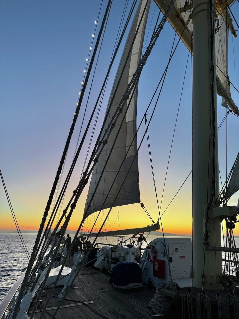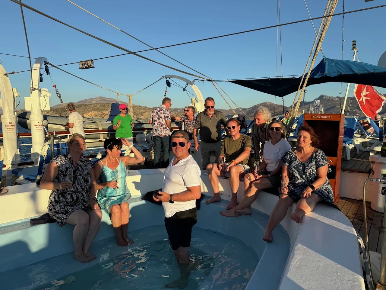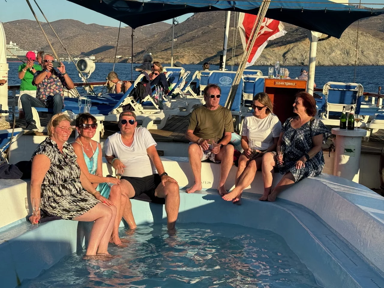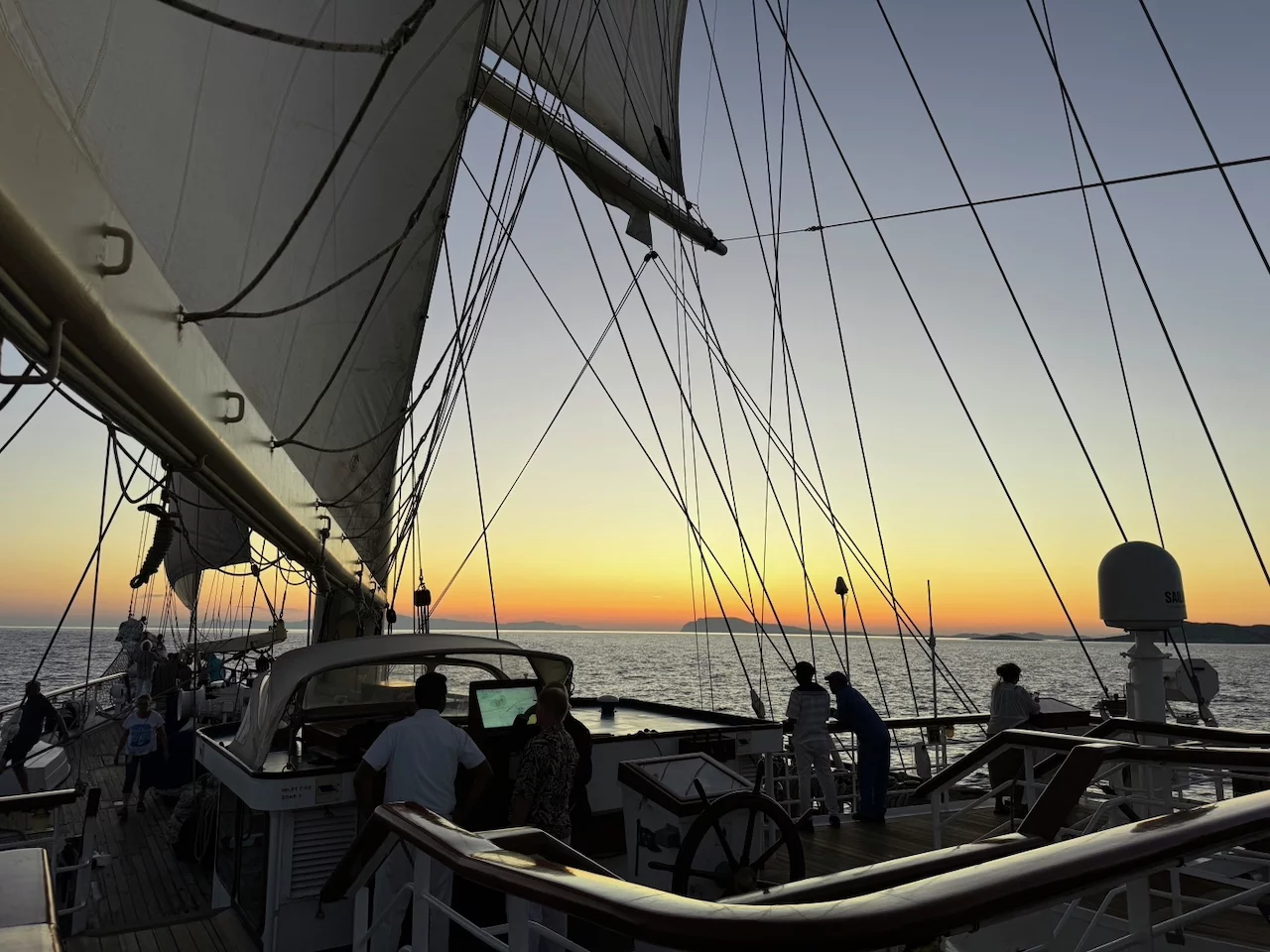 Um 18:00 Uhr ließ der Kapitän wie geplant den Anker hieven und die Star Clipper nahm Kurs auf unser nächstes Ziel Mykonos. Und natürlich traf sich die Gruppe wieder am Pool auf dem hinteren Sonnendeck. Das Hissen der Segel und die Hymne gemeinsam bei einem Drink zu geniessen und in den langsam beginnenden Sonnenuntergang zu segeln, ist jedesmal wieder ein ganz besonderer Moment.