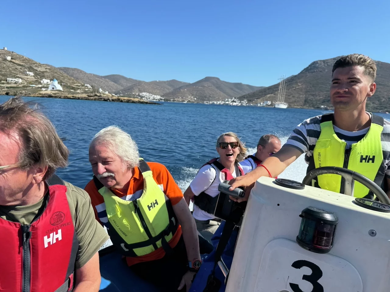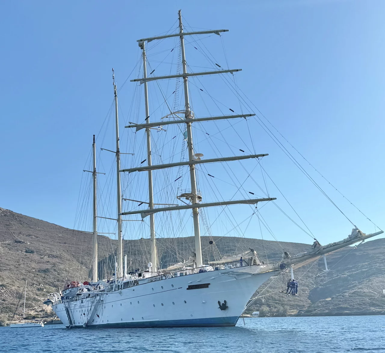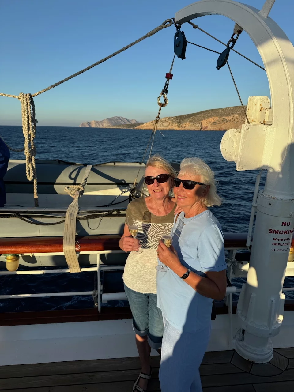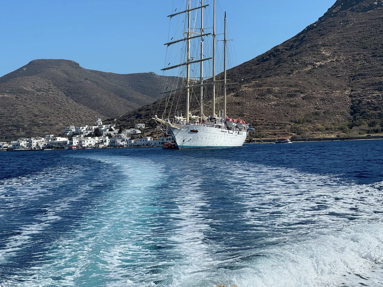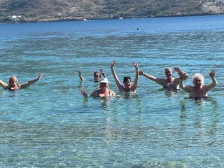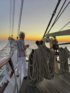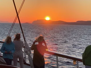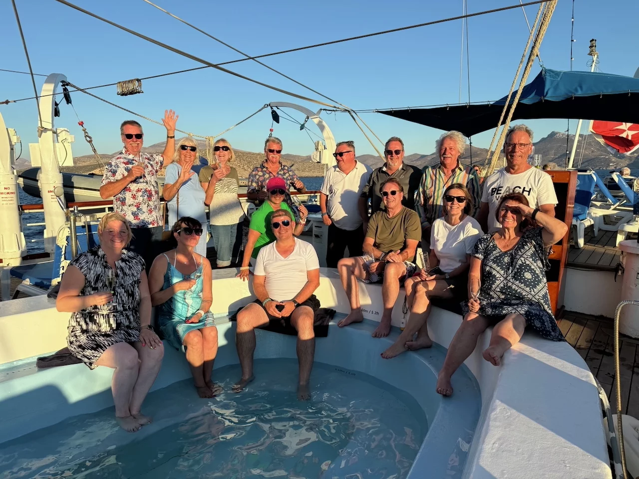 Um 18:00 Uhr ließ der Kapitän wie geplant den Anker hieven und die Star Clipper nahm Kurs auf unser nächstes Ziel Mykonos. Und natürlich traf sich die Gruppe wieder am Pool auf dem hinteren Sonnendeck. Das Hissen der Segel und die Hymne gemeinsam bei einem Drink zu geniessen und in den langsam beginnenden Sonnenuntergang zu segeln, ist jedesmal wieder ein ganz besonderer Moment.