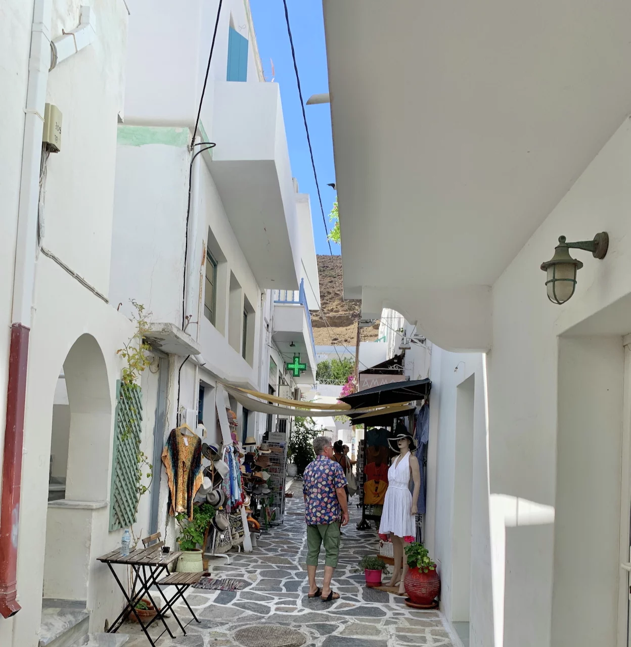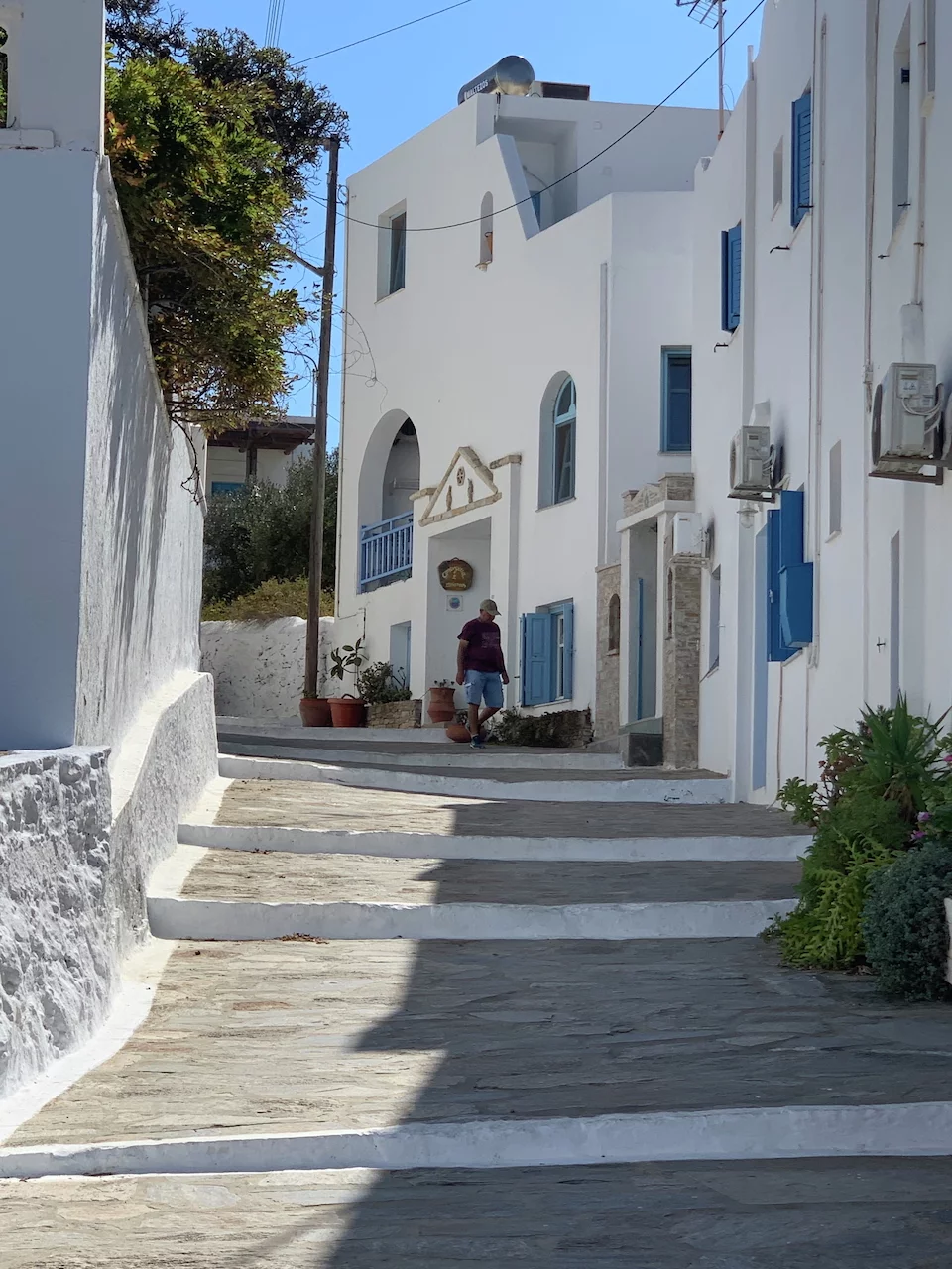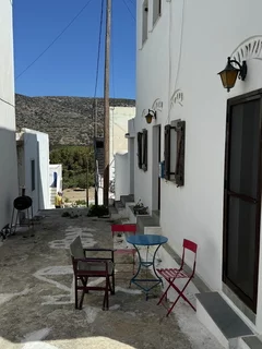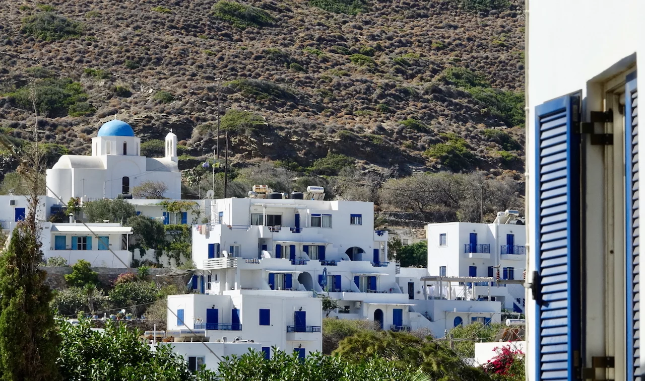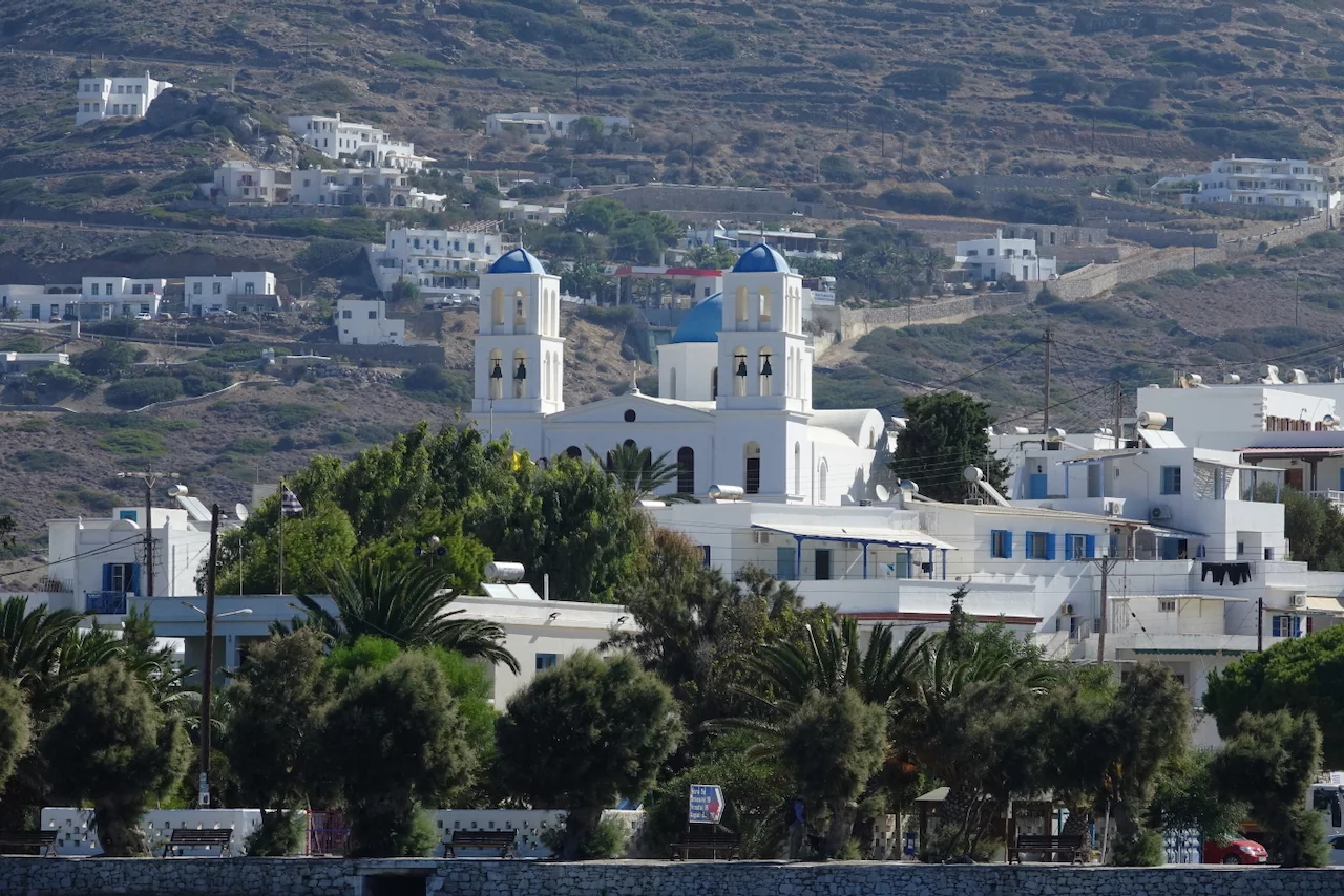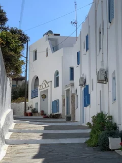 Der hübsche kleine Ort ist verwinkelt angelegt, man flaniert durch verwunschene enge Gassen. Die Häuser sind ganz dem typischen kykladischen Architekturstil folgend gebaut. So reihen sich schachtelförmige schneeweiße Häuschen, mit gelegentlich zu sehenden blauen Verzierungen, aneinander.