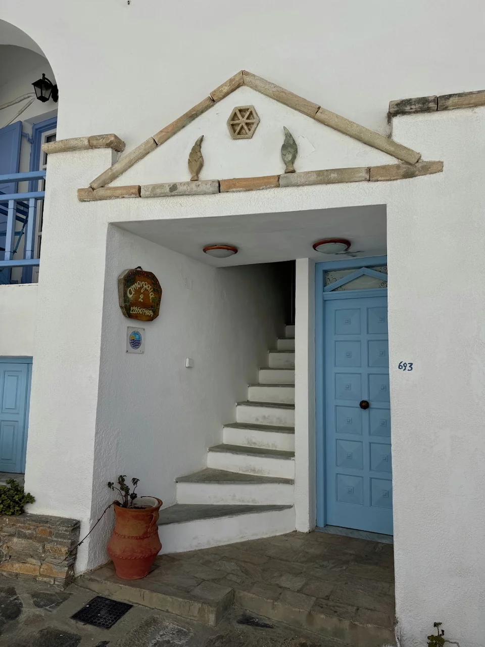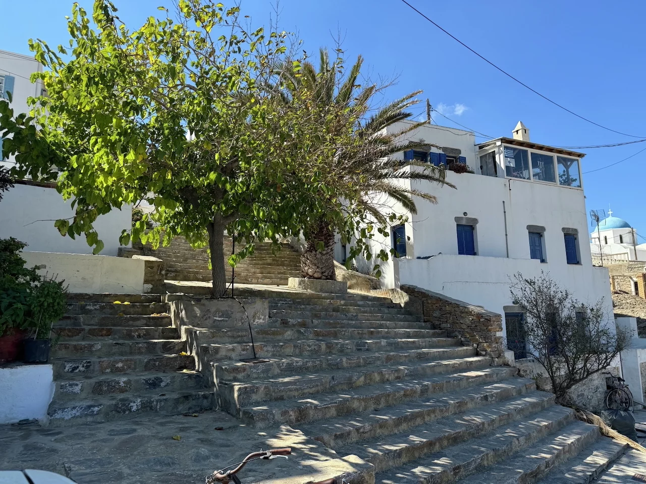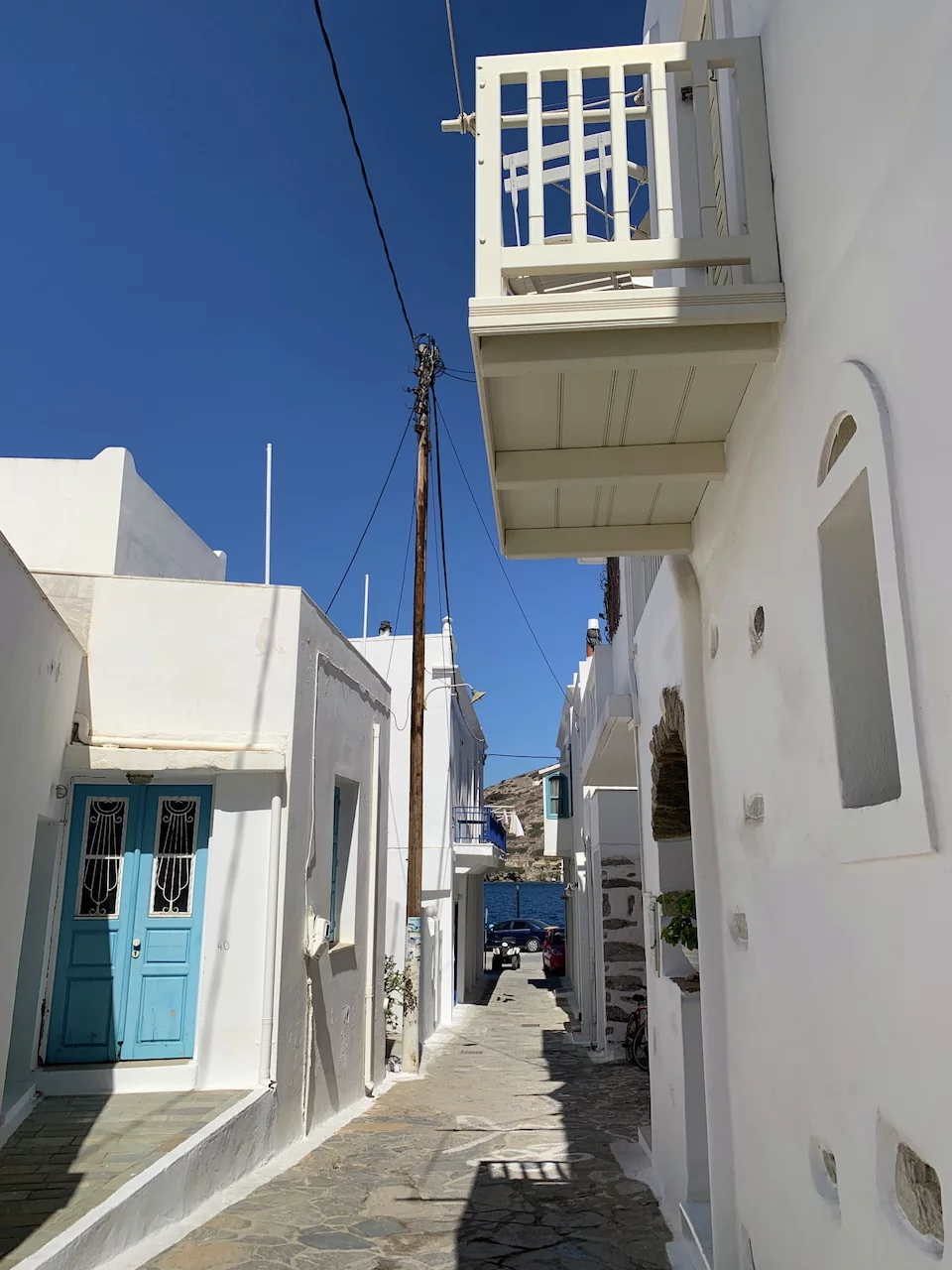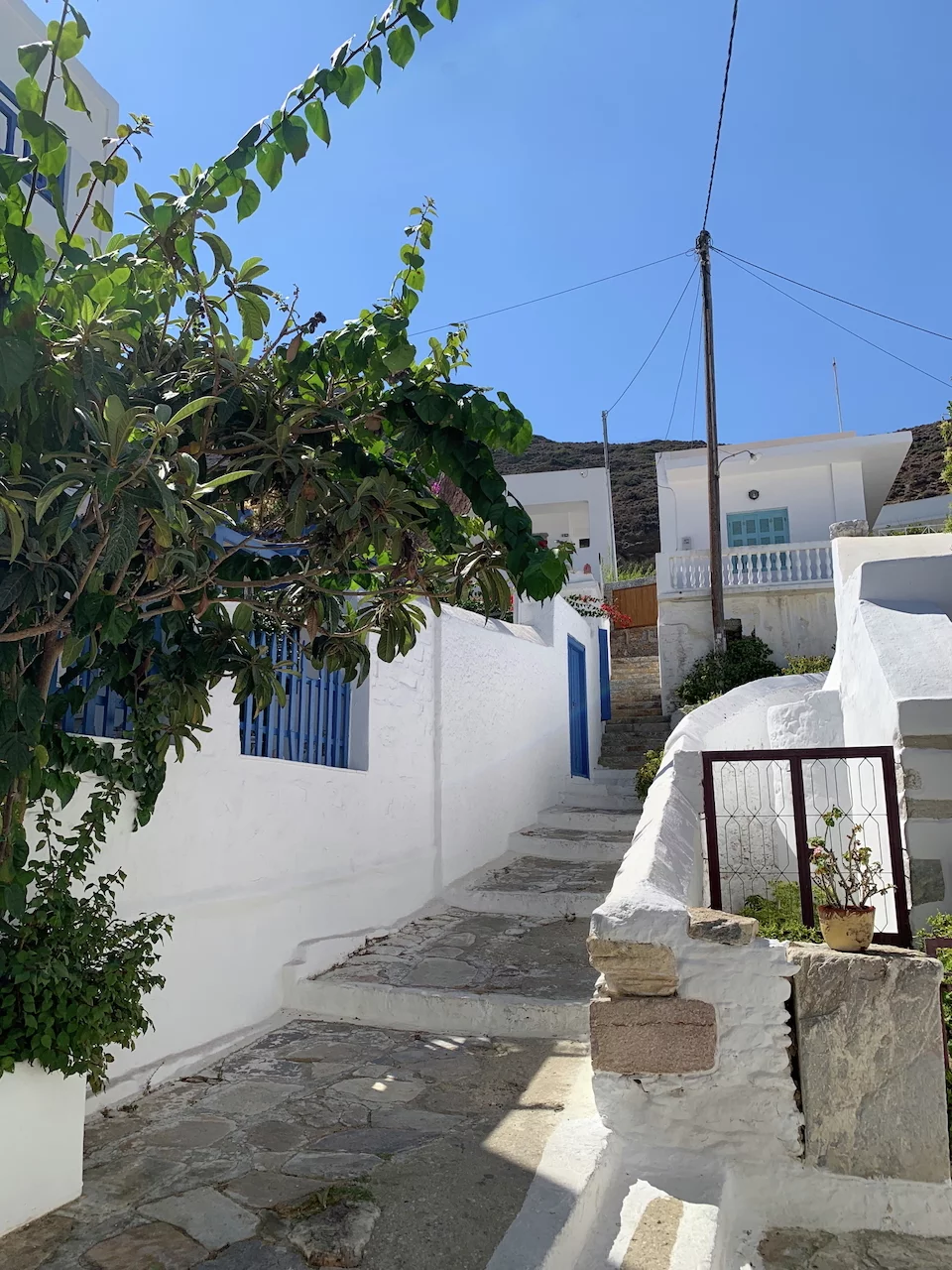 Der hübsche kleine Ort ist verwinkelt angelegt, man flaniert durch verwunschene enge Gassen. Die Häuser sind ganz dem typischen kykladischen Architekturstil folgend gebaut. So reihen sich schachtelförmige schneeweiße Häuschen, mit gelegentlich zu sehenden blauen Verzierungen, aneinander.