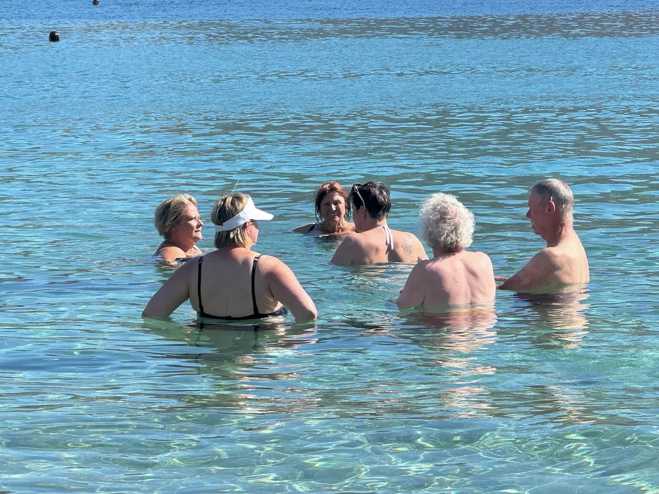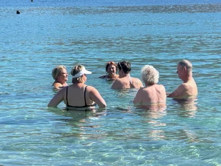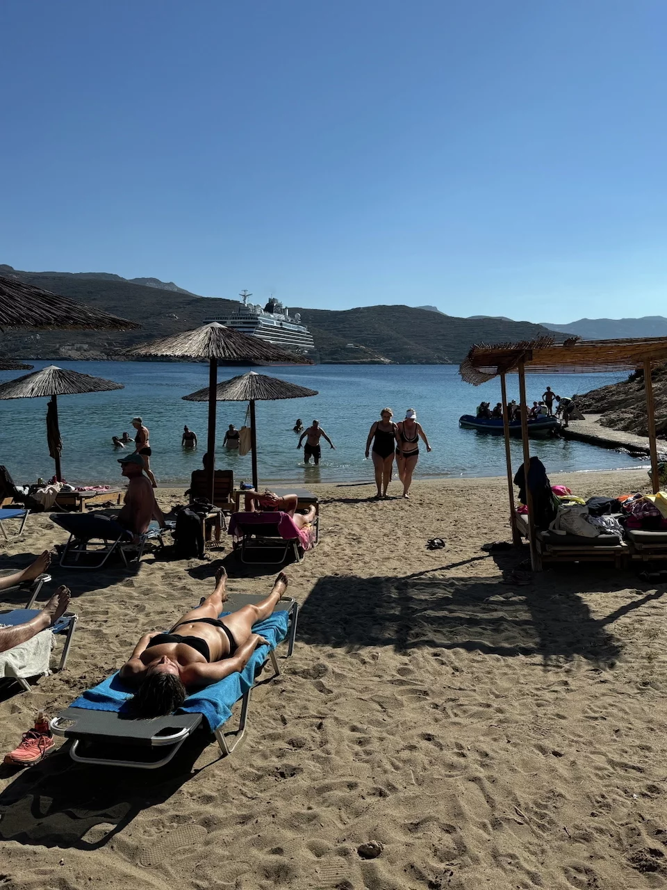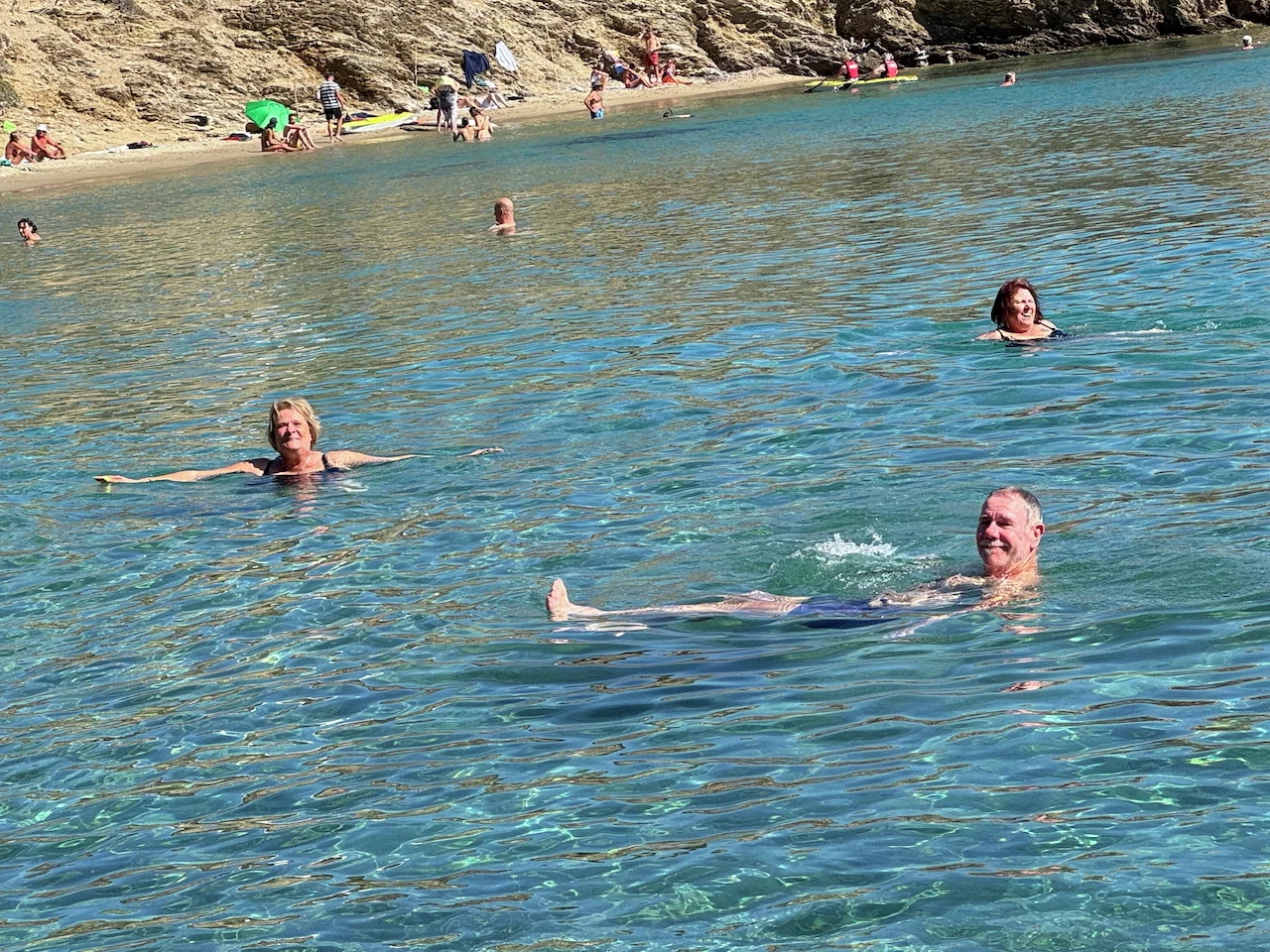 Für den Nachmittag war Schwimmen im Meer angesagt. Mit einem Zodiac ging es rüber zum Maltezi Beach. Das glasklare, türkisfarbene, 25° warme Wasser der Bucht war ein Traum. Was man von den Preisen für Liegen und Sonnenschutz allerdings nicht gerade behaupten konnte.