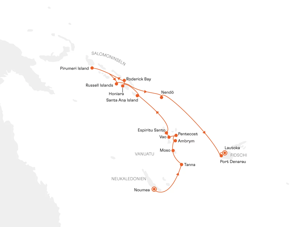 Die geplante Route führt uns zunächst in die Inselwelt von Vanuatu. Anschließend "entdecken" wir einige der Salomon Inseln. Von dort geht es dann weiter nach Fidschi.