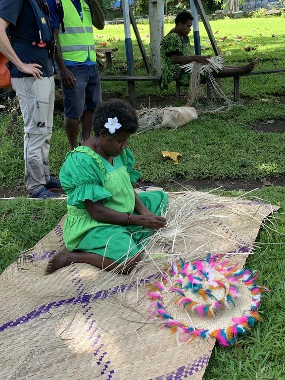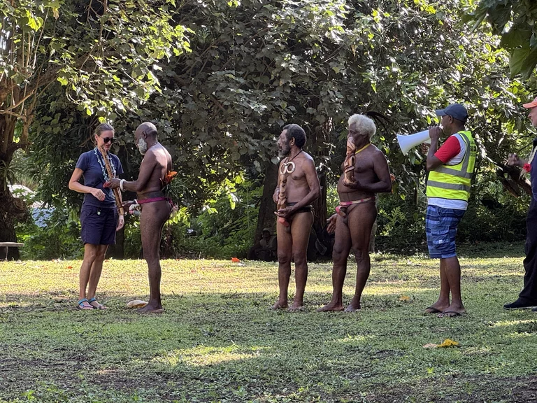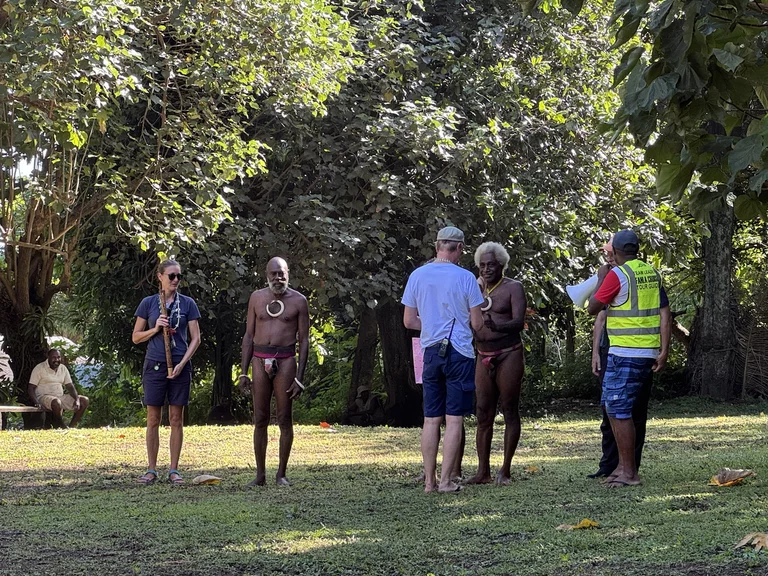 Für die Hanseatic Inspiration ist auch dieses Ziel ein sogenannter Erstanlauf. Das bedeutet unter anderem, dass entweder der Kapitän oder ein anderer hochrangiger Offizier mit dem Chief oder Dorfältesten Willkommensgeschenke austauscht. Von Seiten der Hanseatic Inspiration sind dies zumeist Dinge, die in der örtlichen Schule gebraucht werden. Natürlich dürfen auch T-Shirts und Kappen mit den Schiffsemblemen nicht fehlen!!