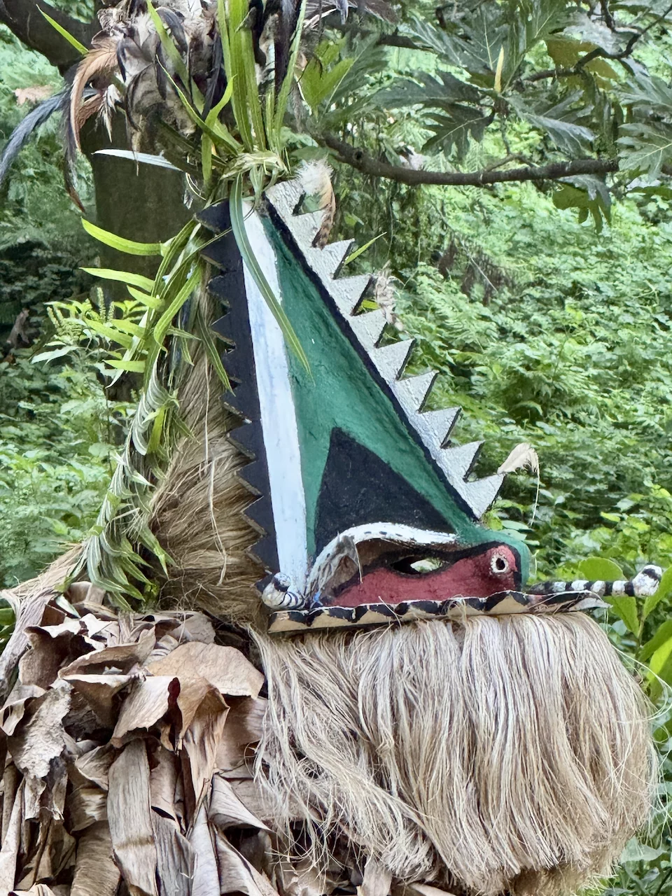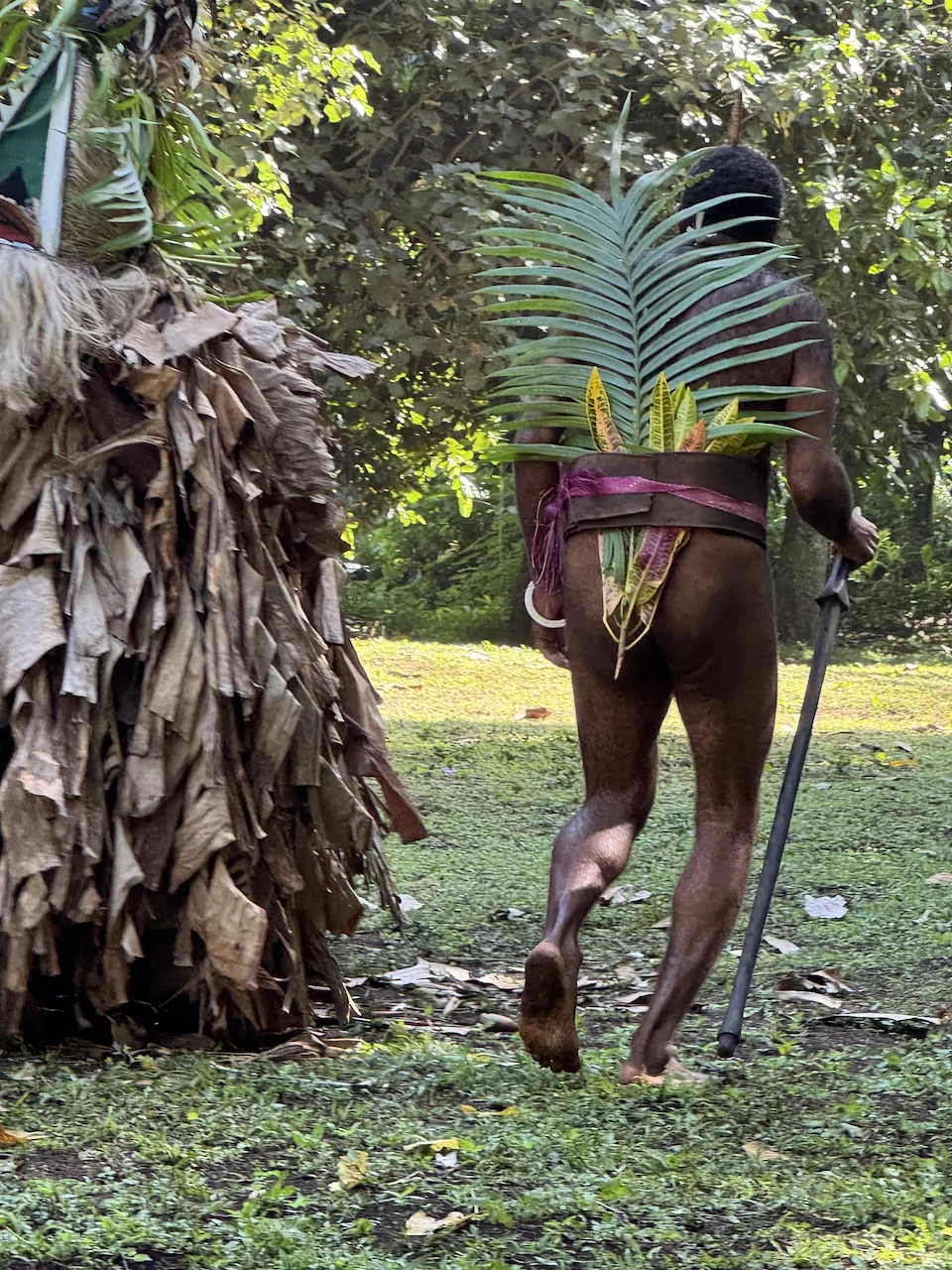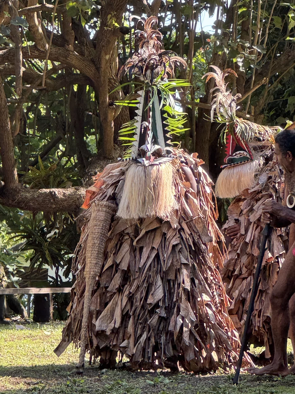 Für uns wurde heute auf dem großen „Festplatz“ eine Vorführung von verschiedenen Kastom-Tänzen, bei den diese rituellen Masken getragen wurden. Diese Masken und die dazugehörige mehrschichtige Kleidung aus Blättern verlangt von den Tänzern eine unglaubliche Kondition, besonders bei den hiesigen klimatischen Bedingungen. Auch wenn der Platz von hohen Bäumen umsäumt ist, gibt es im Zentrum kaum Schatten. Wir haben zumeist im Schatten der Bäume gesessen, trotzdem lief der Schweiß in Strömen. Trotzdem war es ein tolles Erlebnis und der geistige Horizont wurde heute vormittag mal wieder um Einiges erweitert.