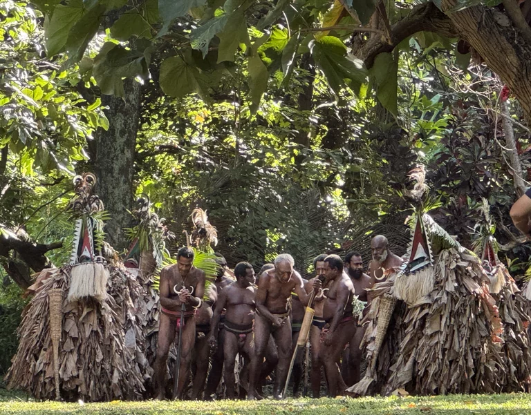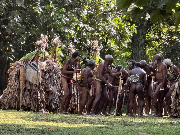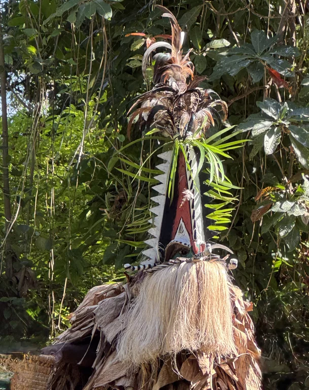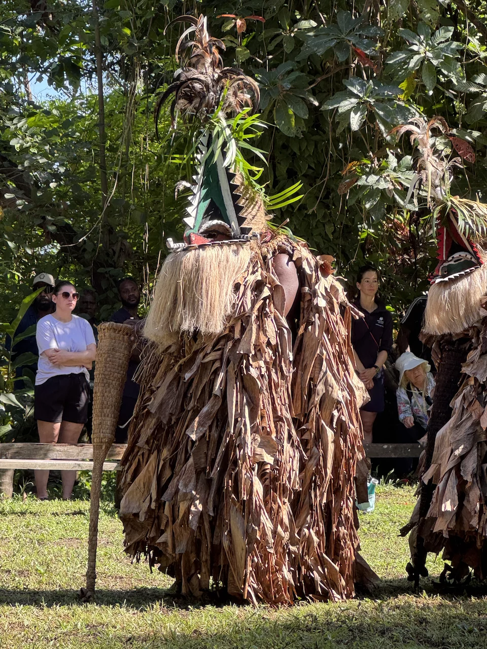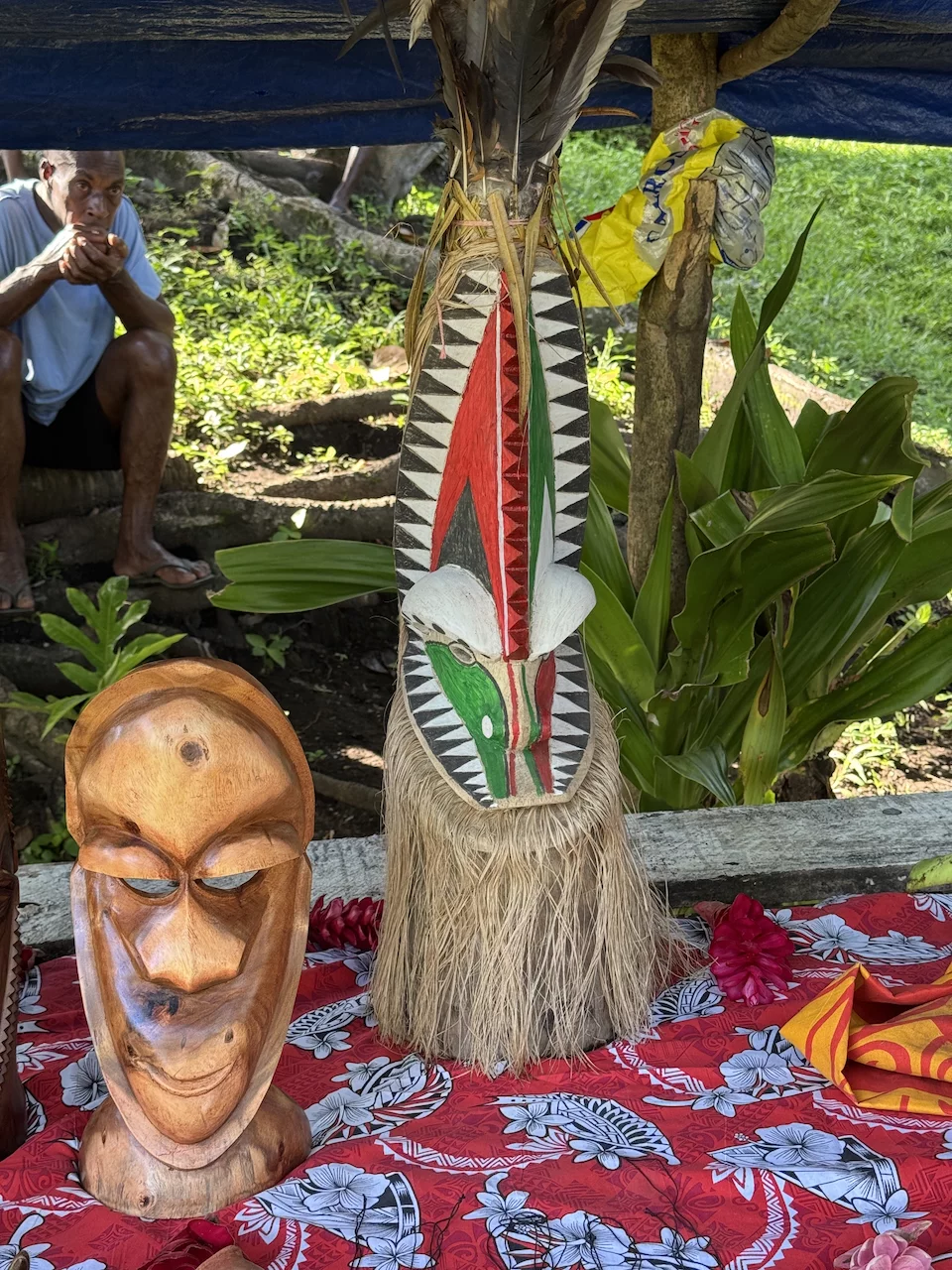 Für uns wurde heute auf dem großen „Festplatz“ eine Vorführung von verschiedenen Kastom-Tänzen, bei den diese rituellen Masken getragen wurden. Diese Masken und die dazugehörige mehrschichtige Kleidung aus Blättern verlangt von den Tänzern eine unglaubliche Kondition, besonders bei den hiesigen klimatischen Bedingungen. Auch wenn der Platz von hohen Bäumen umsäumt ist, gibt es im Zentrum kaum Schatten. Wir haben zumeist im Schatten der Bäume gesessen, trotzdem lief der Schweiß in Strömen. Trotzdem war es ein tolles Erlebnis und der geistige Horizont wurde heute vormittag mal wieder um Einiges erweitert.
