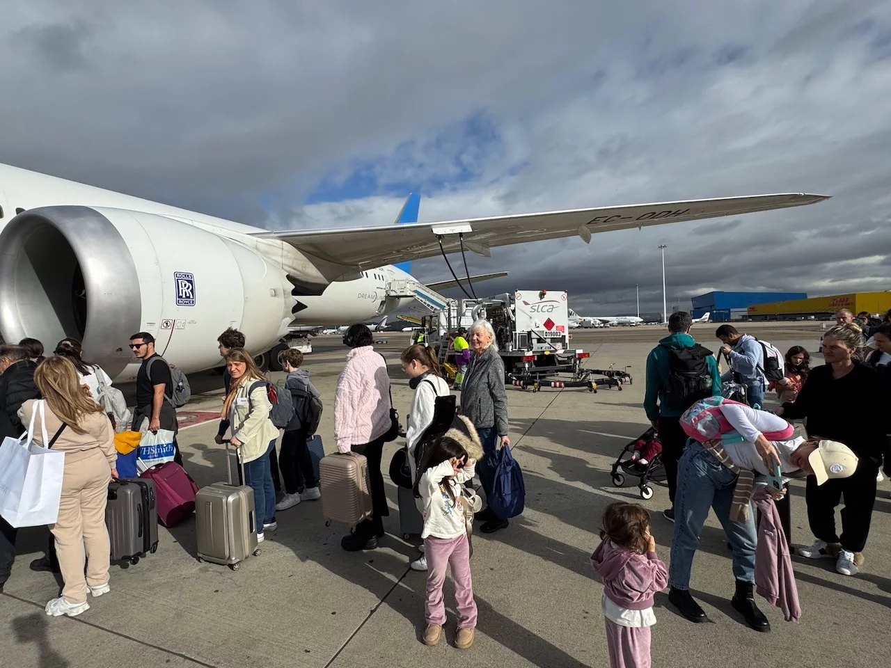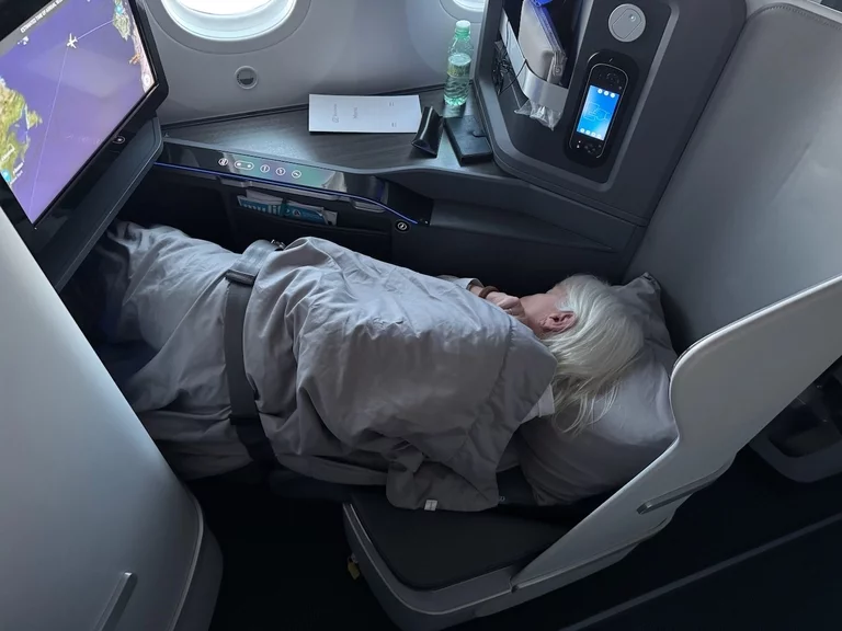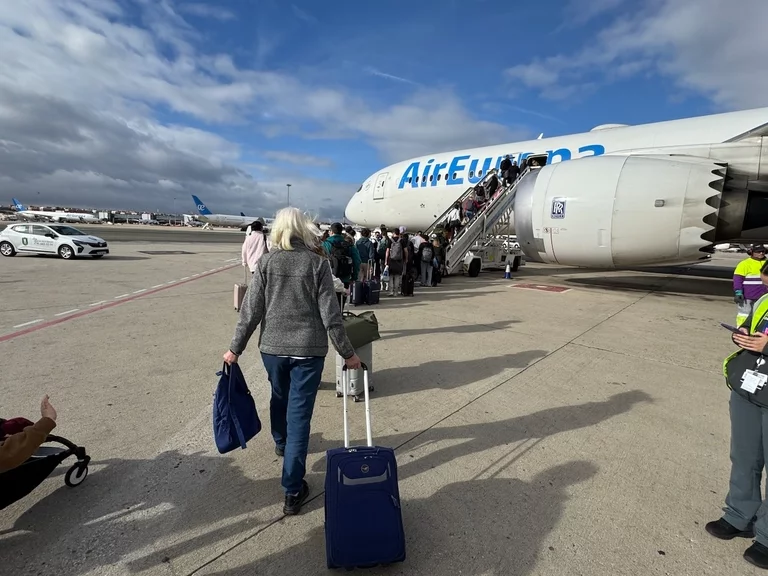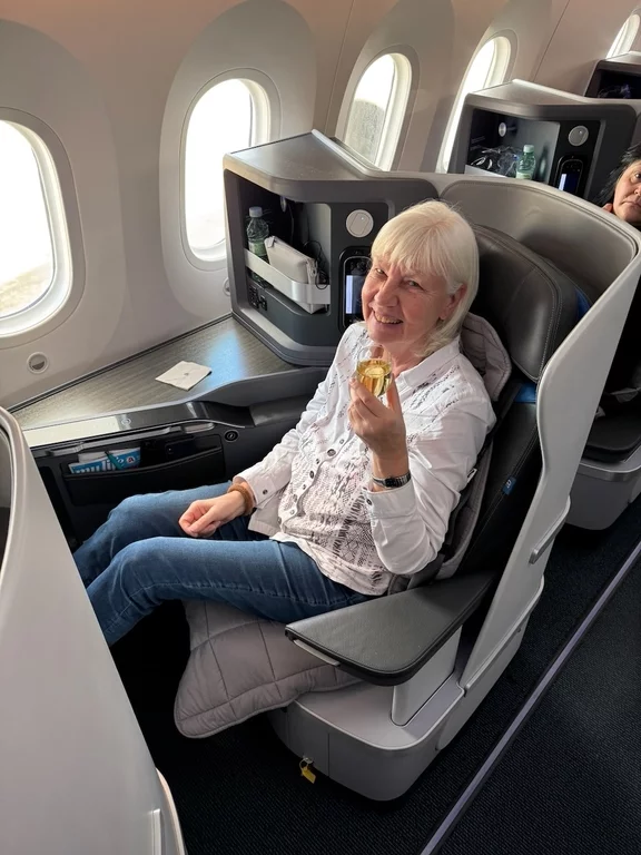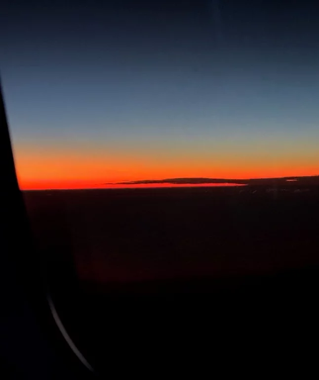 Dann hat uns der Zufallsgenerator am Gate in Madrid für einen gründlichen Sicherheitscheck auf Sprengstoff an Kleidung, Extremitäten (!?) und mitgeführten elektronischen Geräten ausgewählt. Die Flüge waren pünktlich und okay. Auf dem Anschlussflug hatten wir aufgrund unserer Flughöhe von 12000 Metern stundenlang einen herrlichen Blick auf den Sonnenuntergang. Es gab auch ein paar Stündchen Schlaf - wie man sieht