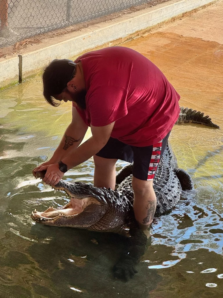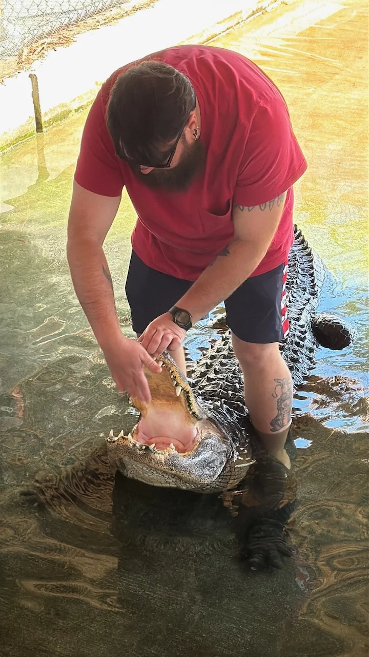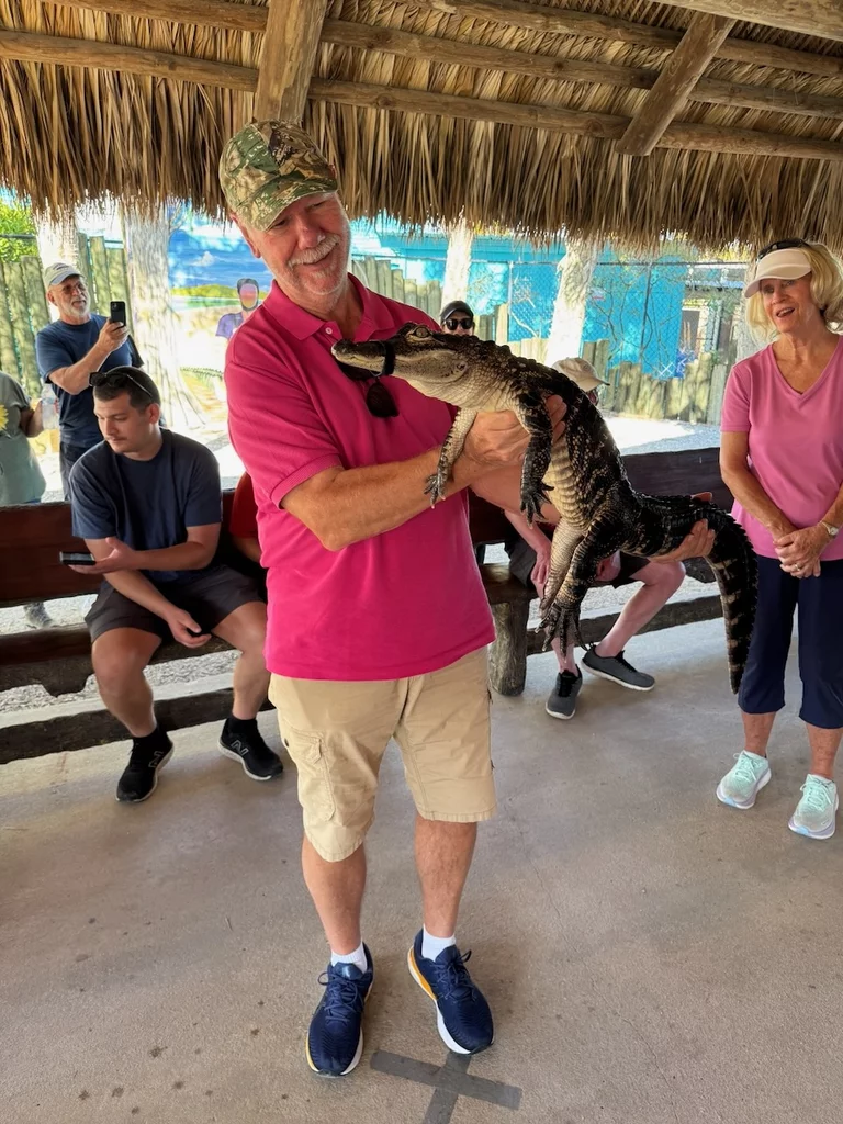 Dann hatten besonders Mutige noch die Gelegenheit , einen kleinen lebenden Alligator auf den Arm zu nehmen. Soviel Mut gehörte allerdings nicht dazu, denn das gefährliche Ende war mit einem Gummiband gesichert.