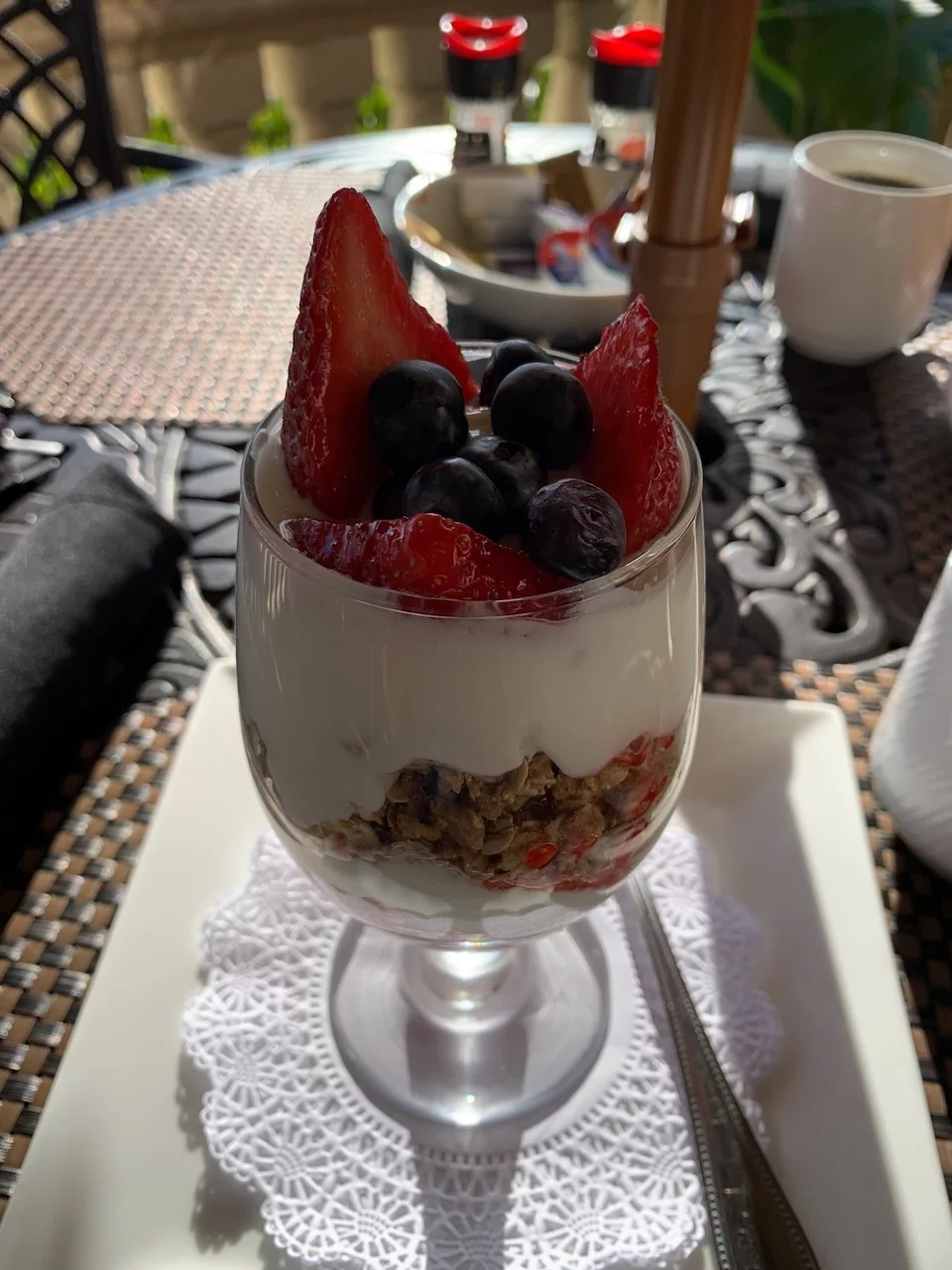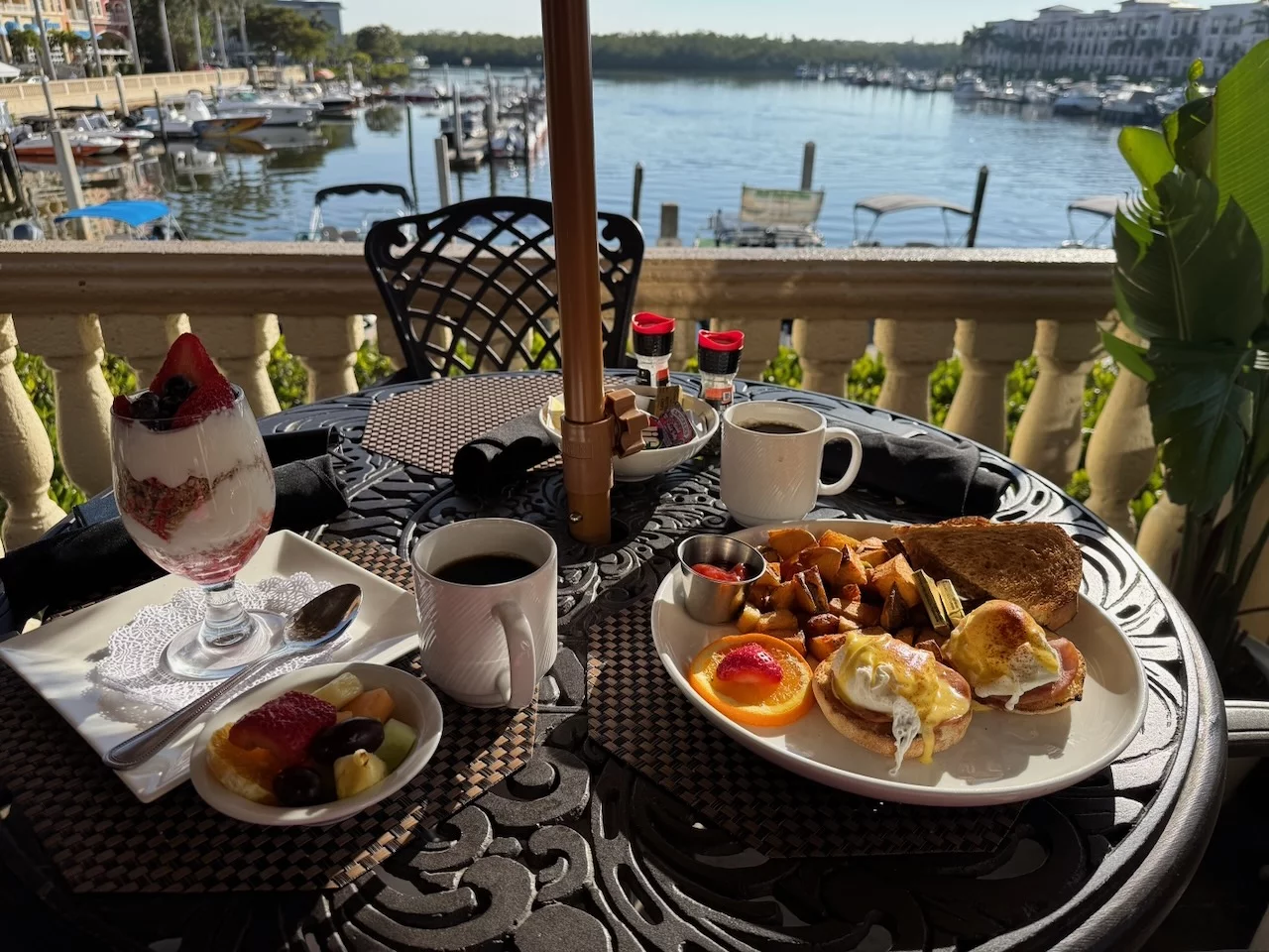 Es begann mit einem sehr leckeren Frühstück auf der Hotelterrasse mit Blick auf die Bay von Naples. Granola mit Joghurt und Früchten, Eggs Benedict und Kaffee bis zum Abwinken..