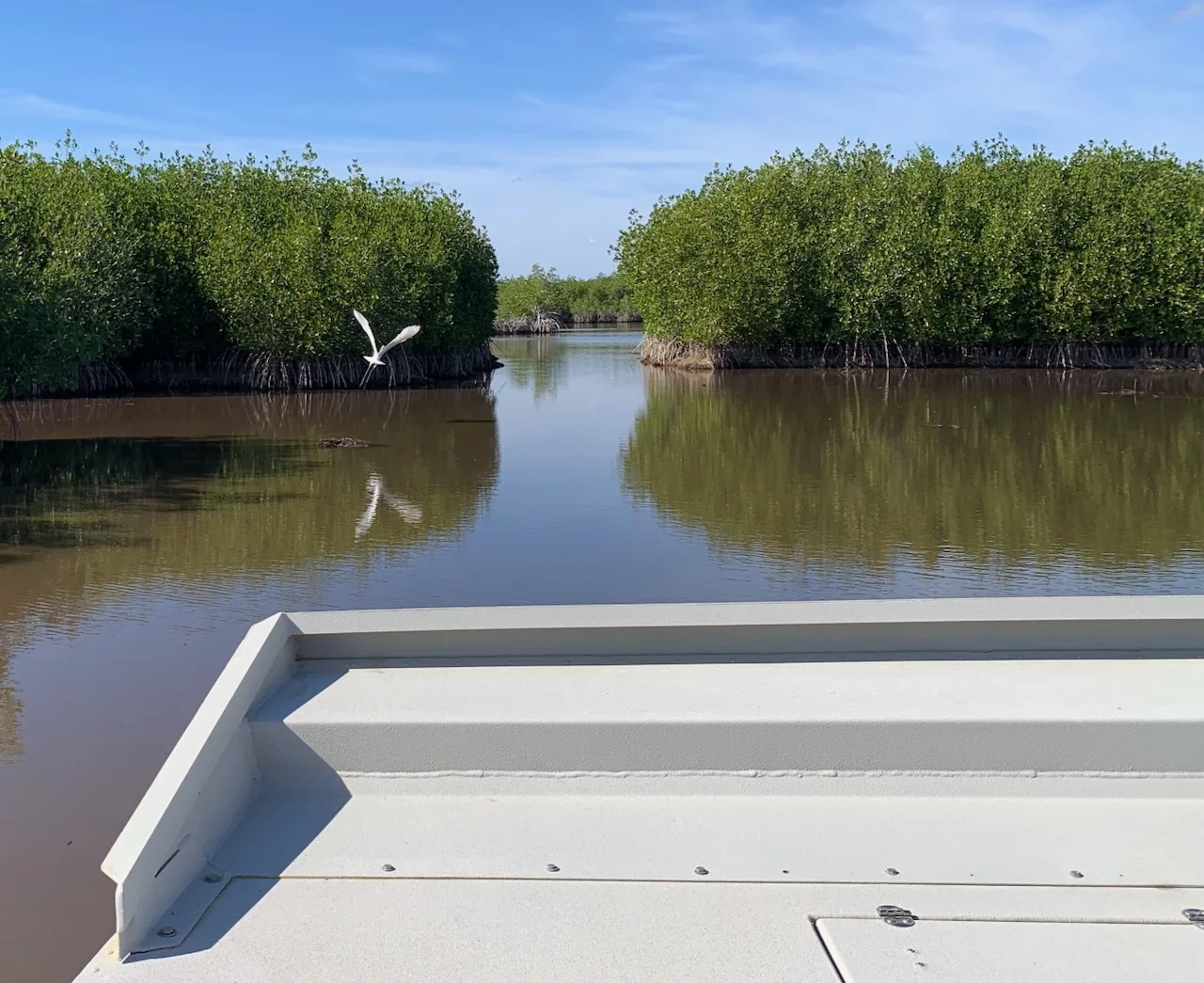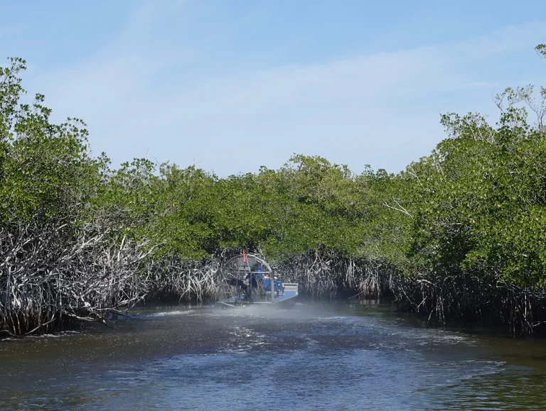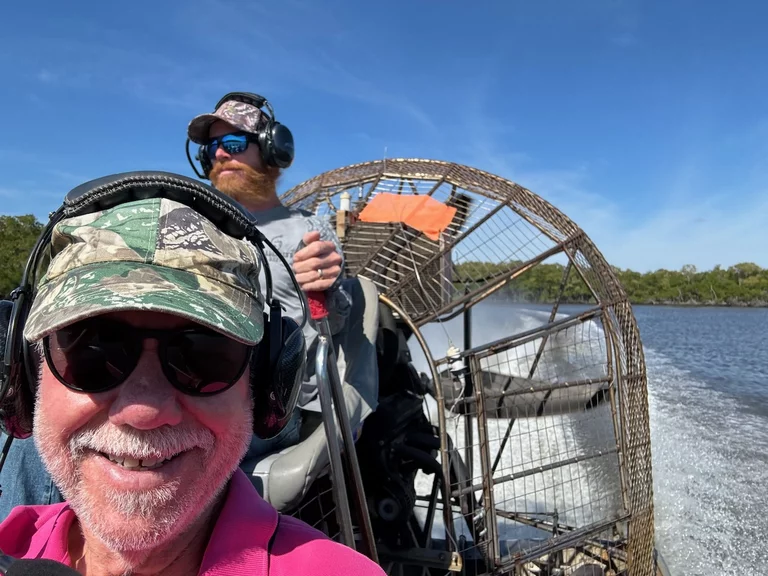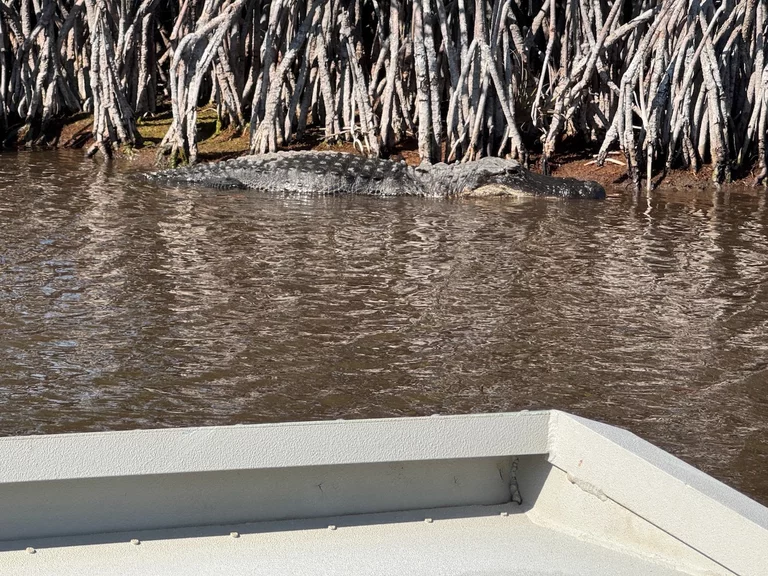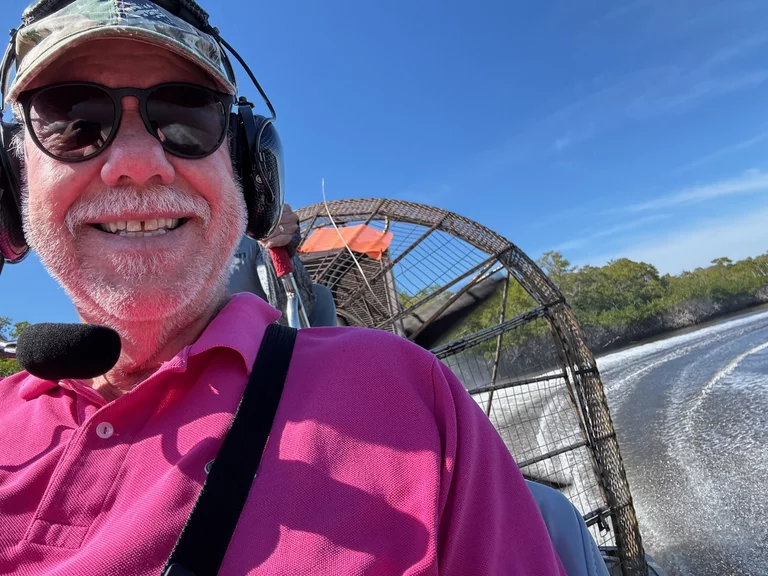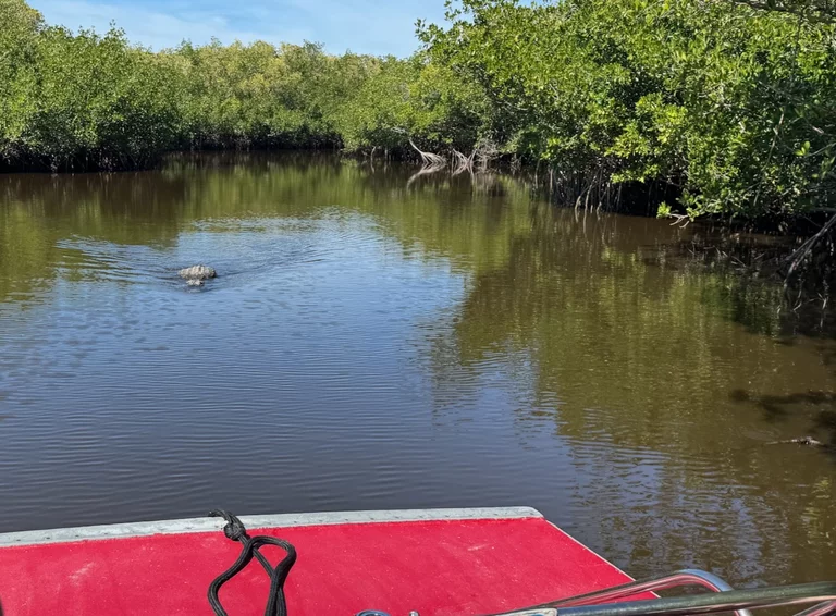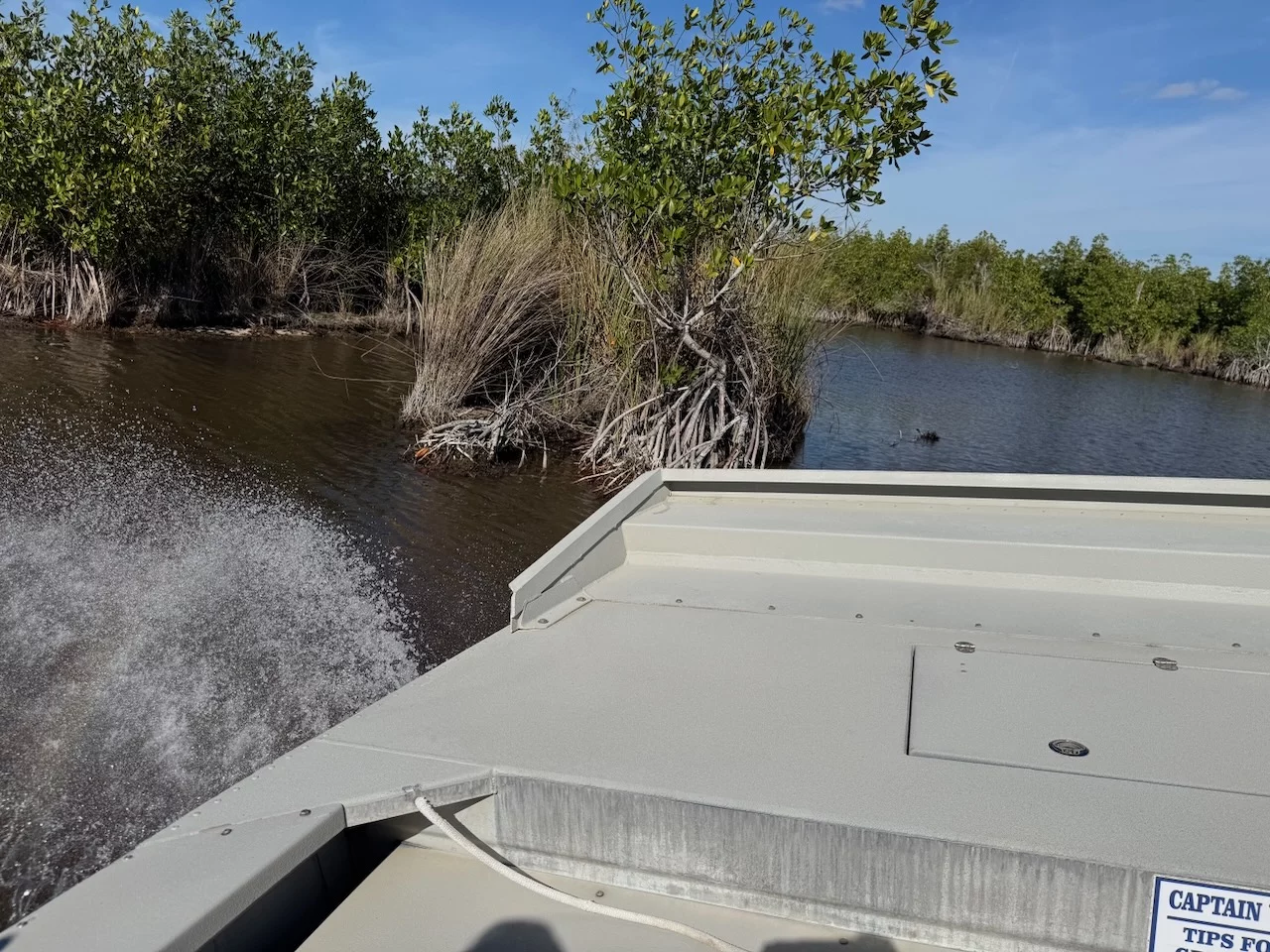 Captain 3, so nannte er sich, sprach einen langgezogenen Südstaaten-Slang, der aber trotzdem recht gut zu verstehen war. Zumindest galt das für die Zeit, wenn das Airboat im Leerlauf lief oder wir langsam gefahren sind. Sobald er richtig Gas gab, überdeckt der Lärm von dieser "Höllenmaschine" im Heck alles andere. Und er gab häufig richtig Gas. Da wird das Blickfeld in den schmalen Mangroventunneln immer enger. Es hat uns einen Riesenspaß gemacht.