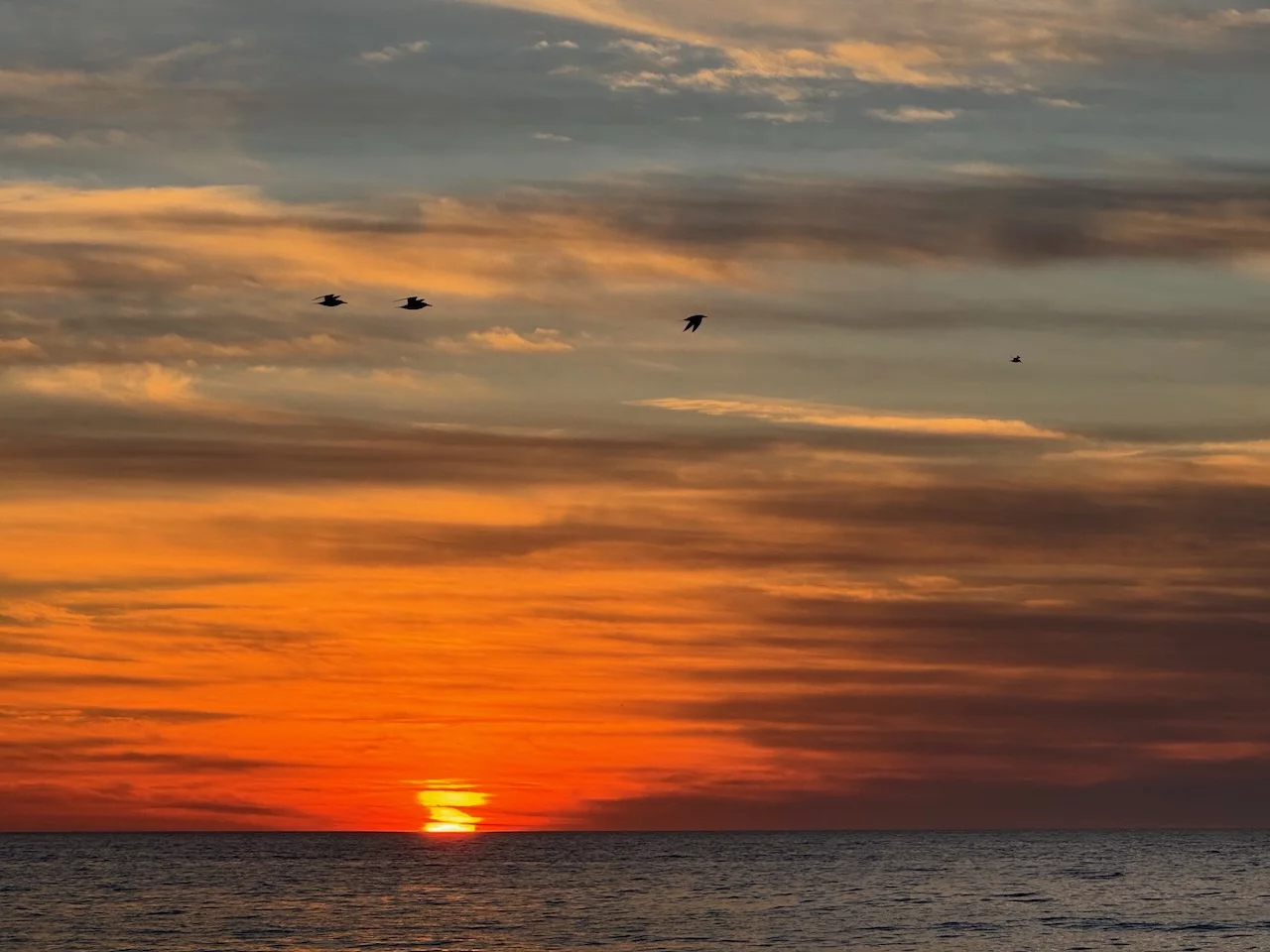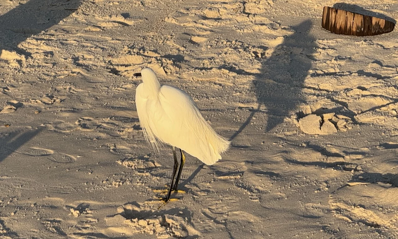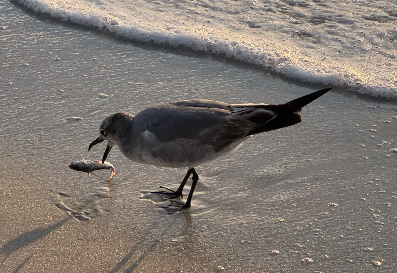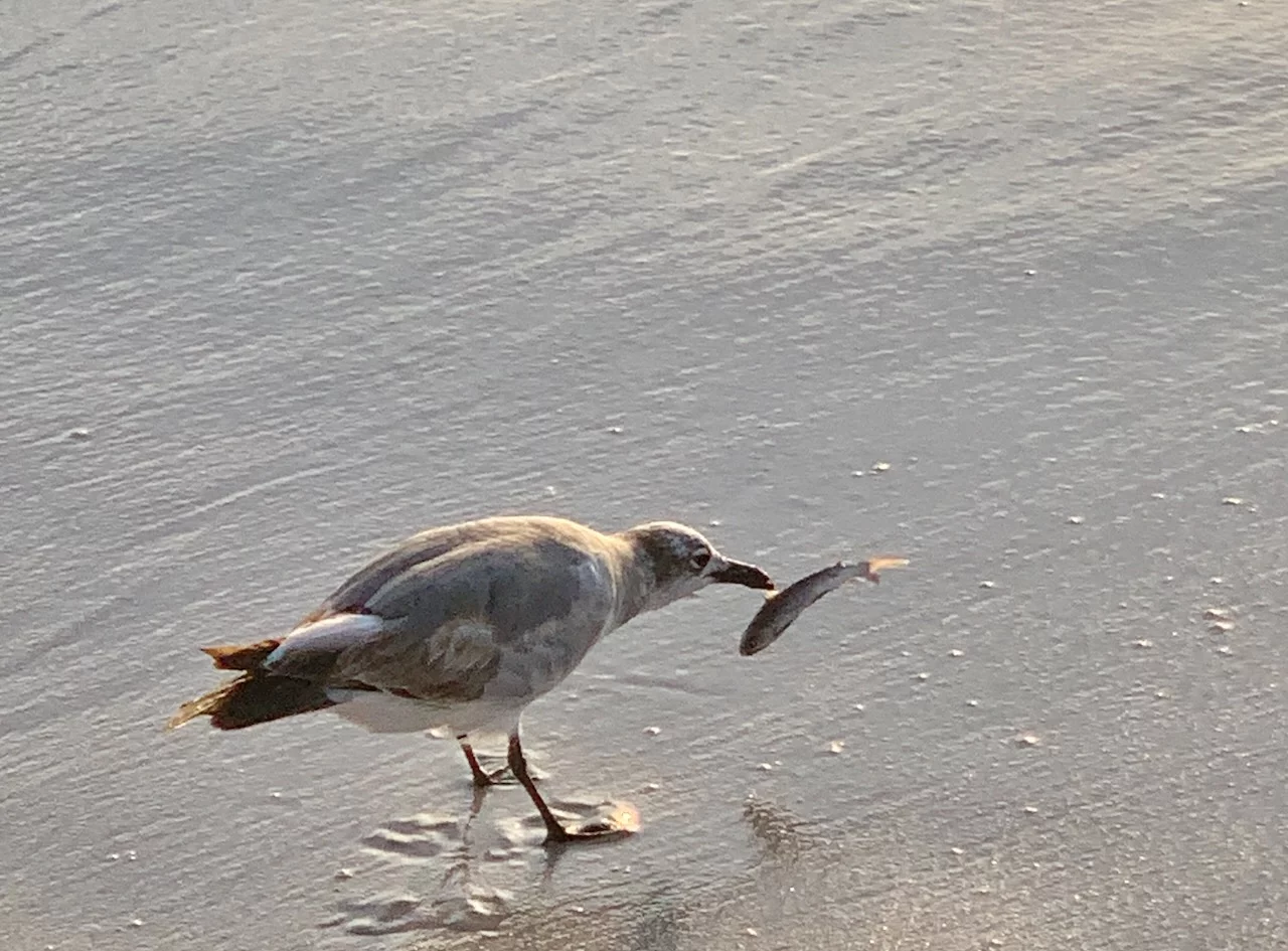 Am Strand angekommen saßen schon viele Sonnenuntergangsanbeter auf ihren mitgebrachten Stühlen oder Decken und warteten auf das tägliche Naturschauspiel. Es sieht schon spektakulär aus, wenn die Sonne ganz langsam in den Golf von Mexico versinkt. Zur Unterhaltung während der Wartezeit tragen Strandläufer bei, die sich an dem "gedeckten Tisch" des Meeres satt fressen, oder ungeschickte junge Möwen, die fast schon verzweifelt versuchen einen kleinen Fisch im Ganzen zu verschlingen.