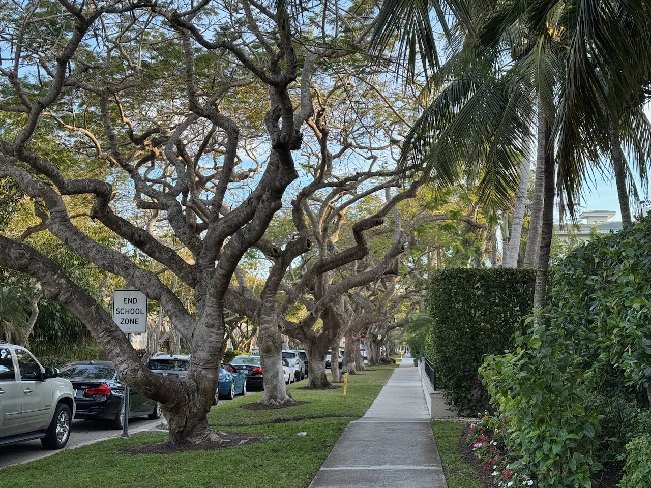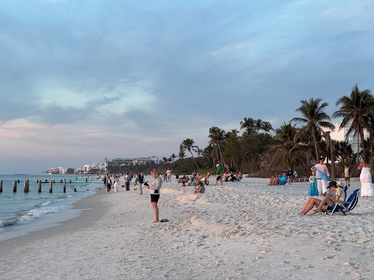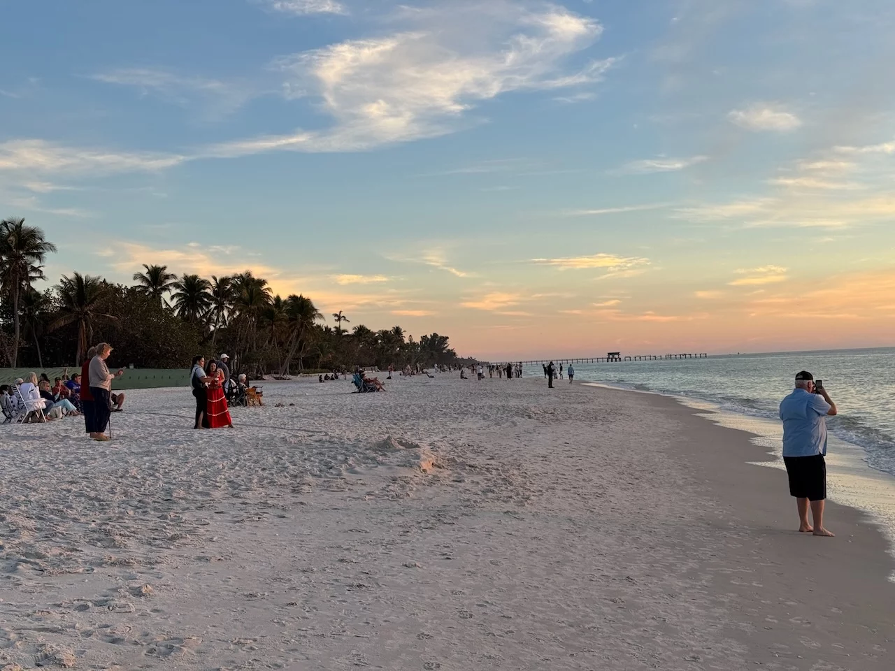 Pünktlich zum Sonnenuntergang waren wir wieder zurück in Naples. Da es am Strand mit Parken so eine Sache ist, haben wir die 2km vom Hotel bs zum Strand zu fuß absolviert. Der Spaziergang führte durch die sehr gepflegte Nachbarschaft von Old Naples. Tolle Häuser mit gepflegten und schön bepflanzten Vorgärten. Die 3rd Avenue hat einen sehenswerten und ungewöhnlichen Baumbestand.