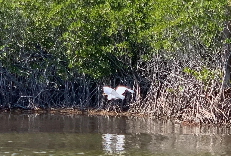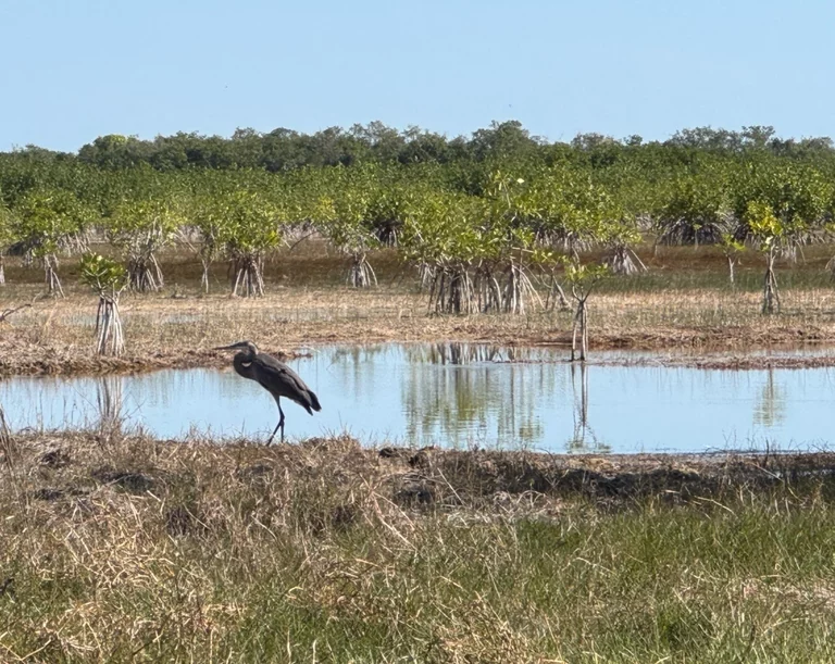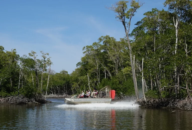 Los ging es mit der Fahrt auf einem 6-sitzigen Airboat durch die Mangroven. Die dauerte ca. 50 Minuten und war ein echtes Erlebnis. Wir wurden mit Kopfhörern ausgerüstet die zum einen als dringend notwendiger Gehörschutz dienten, zum andern aber auch ein Mikrofonverbindung unter Fahrern und Teilnehmer war. Außer uns waren noch 4 Holländer an Bord.