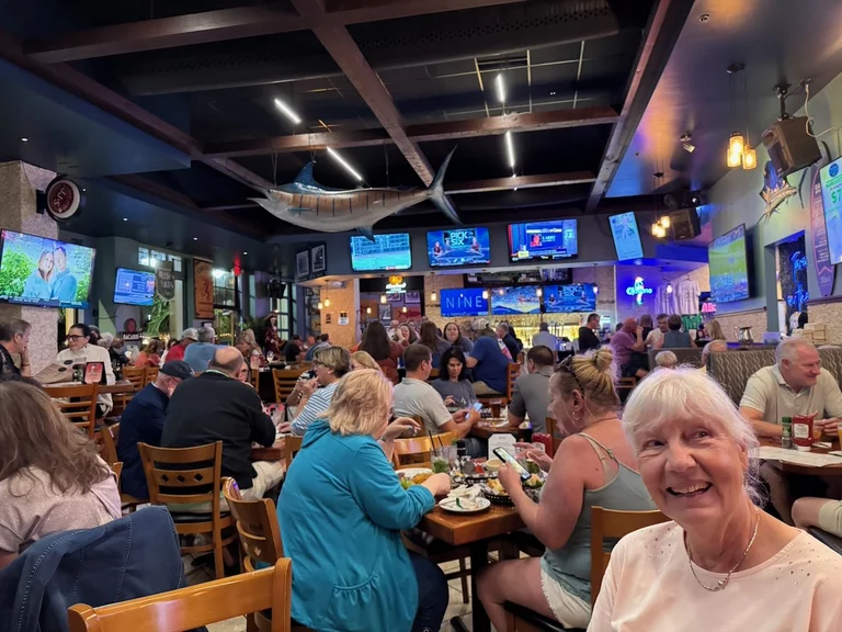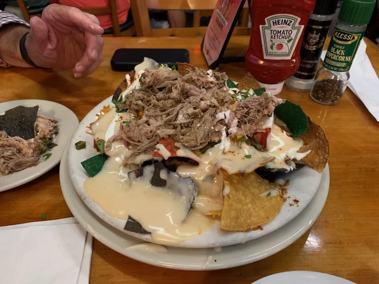 Zum Autofahren hatten wir anschließend keine große Lust mehr. Deshalb gab es Abendessen in der Sportsbar nebenan. Heute viel die Wahl auf Nachos, mit Käse überbacken und Pulled Pork on Top. Da wir am Tag vorher gesehen haben, was für eine Monster-Portion davon serviert wird, haben wir uns dieselbige geteilt. Und es war wie erwartet nicht nur saulecker, sonder auch genug für 2 Personen.